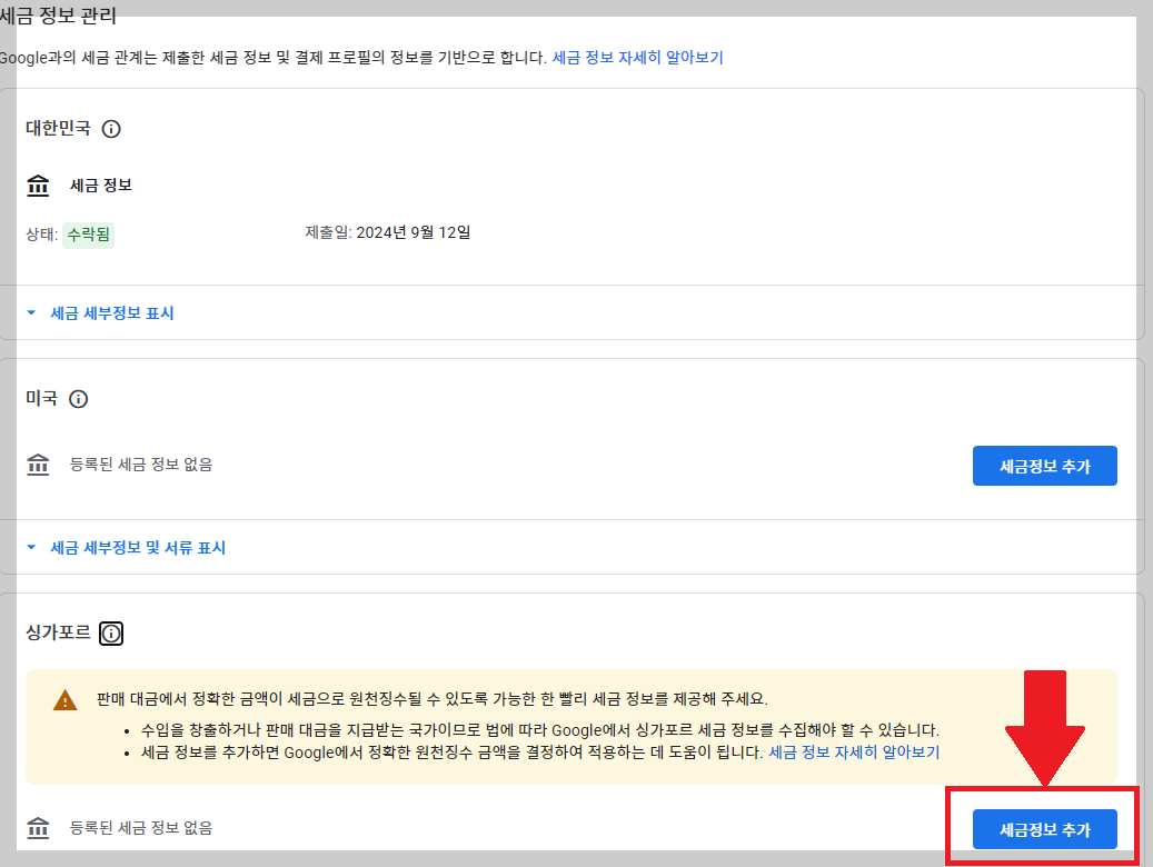 싱가포르에서는 외국 기업의 수익에 대해 원천징수를 실시합니다. 쉽게 말해서, 구글이 여러분을 대신해 세금을 미리 징수하여 정부에 납부하는 거예요. 이때 여러분이 입력하신 세금 정보에 따라 원천징수 금액이 달라질 수 있습니다.