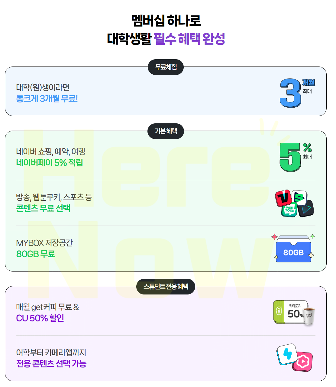 네이버 멤버십에서 대학(원) 생이라면 '통 크게 3개월 무료 이벤트'가 있습니다. 이벤트가 사라지기 전에 빠르게 신청해 보세요.