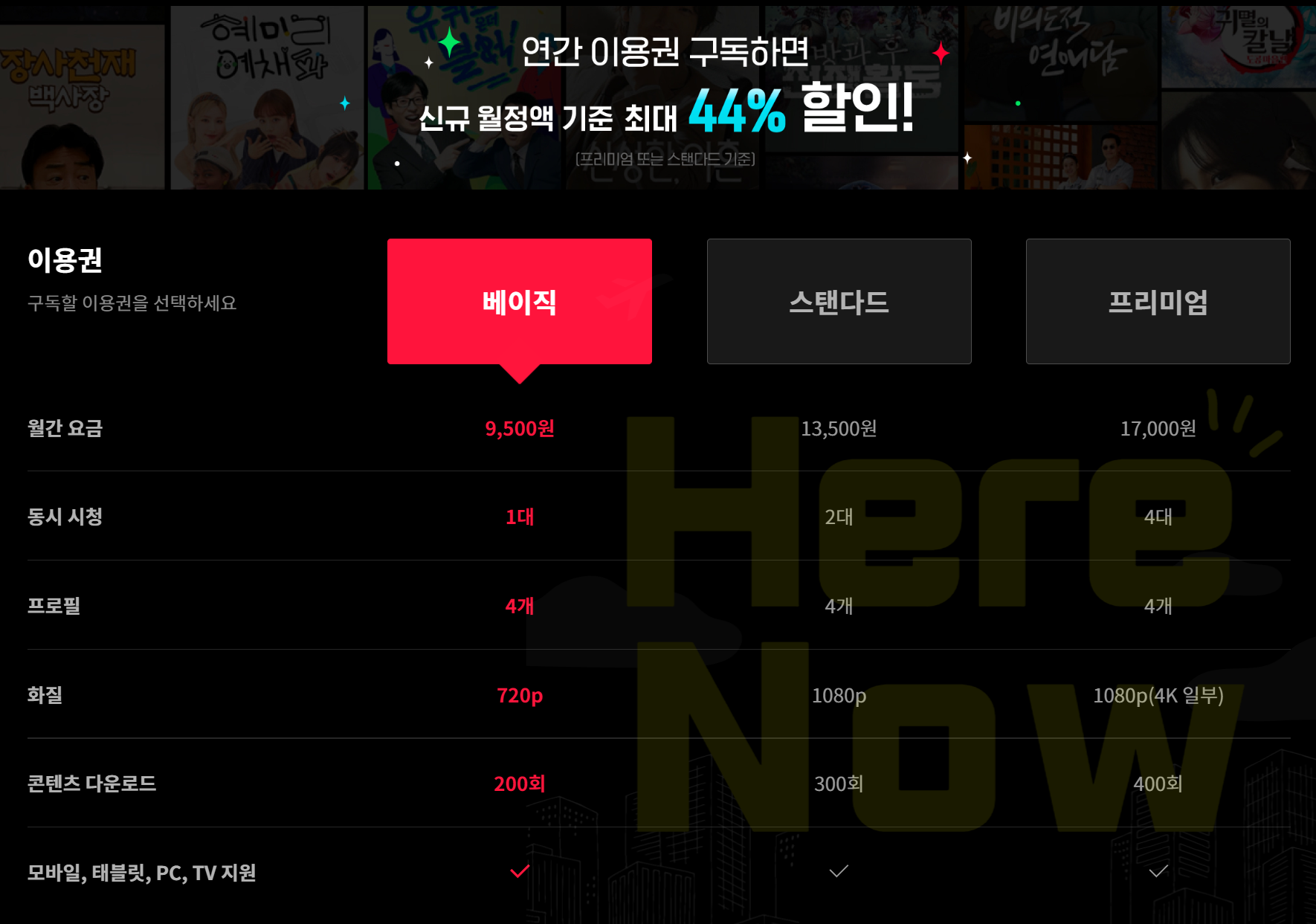 티빙은 베이직 9,500원, 스탠더드 13,500원, 프리미엄 17,000원으로 3가지 이용권이 있습니다. 매달 부과되는 이용료입니다. 현재 연간 이용권 구독 행사를 진행하고 있어서 1년 단위로 구독하신다면 저렴한 가격으로 볼 수 있습니다.