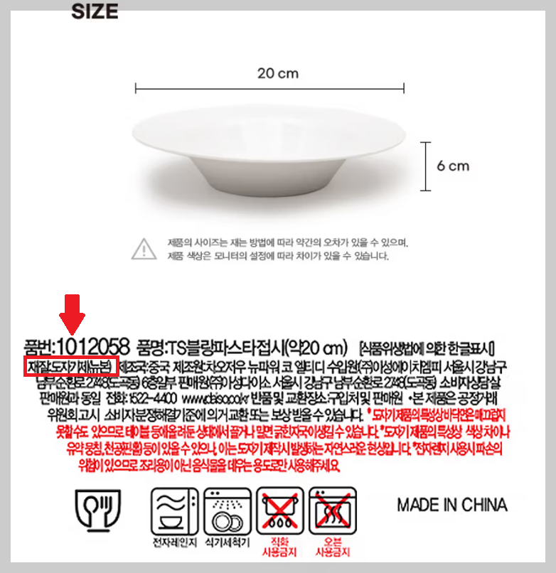 그릇 뒷면에 '단순 도자기재'라고 적혀 있는 제품