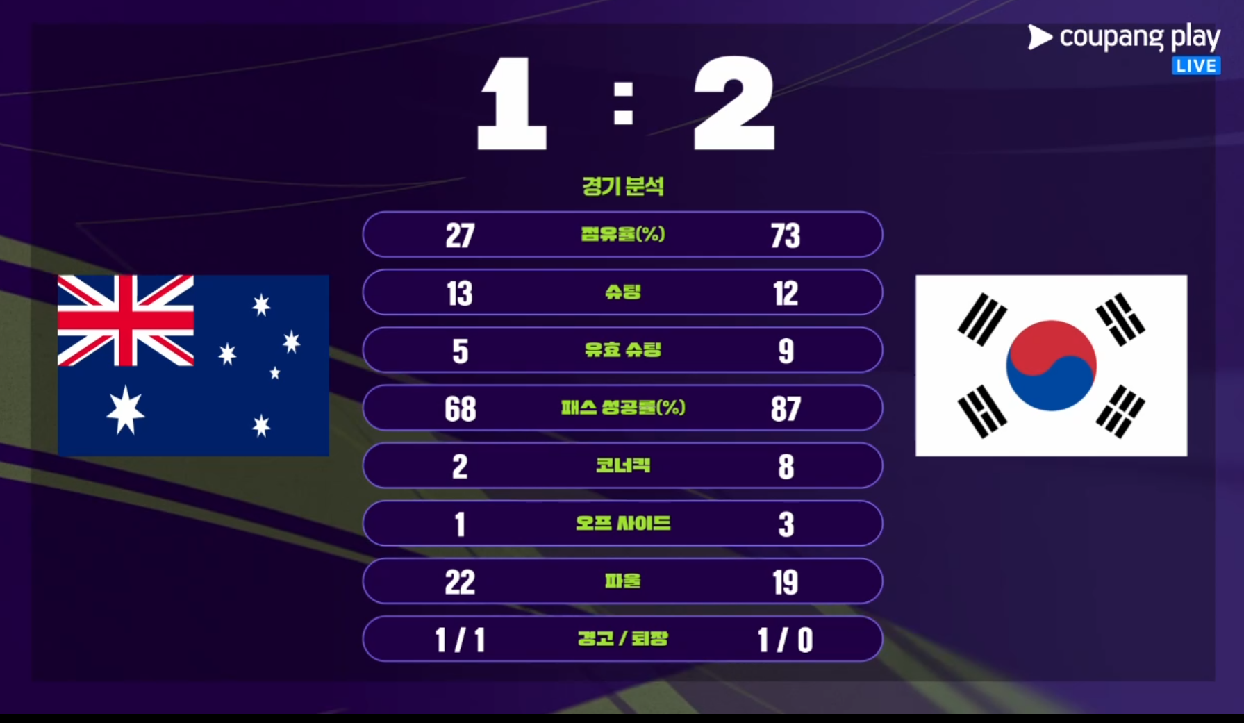 호주와 대한민국의 경기는 어땠을까요? 승리에 하이라이트 영상과 쿠팡플레이에서 제공하는 매치도너먼트 내용도 있으므로 전후반에 대한 분석 내용도 확인 하실 수 있습니다.