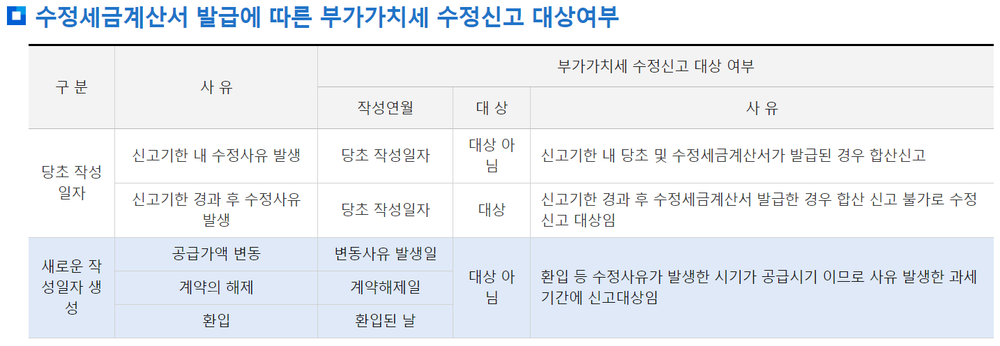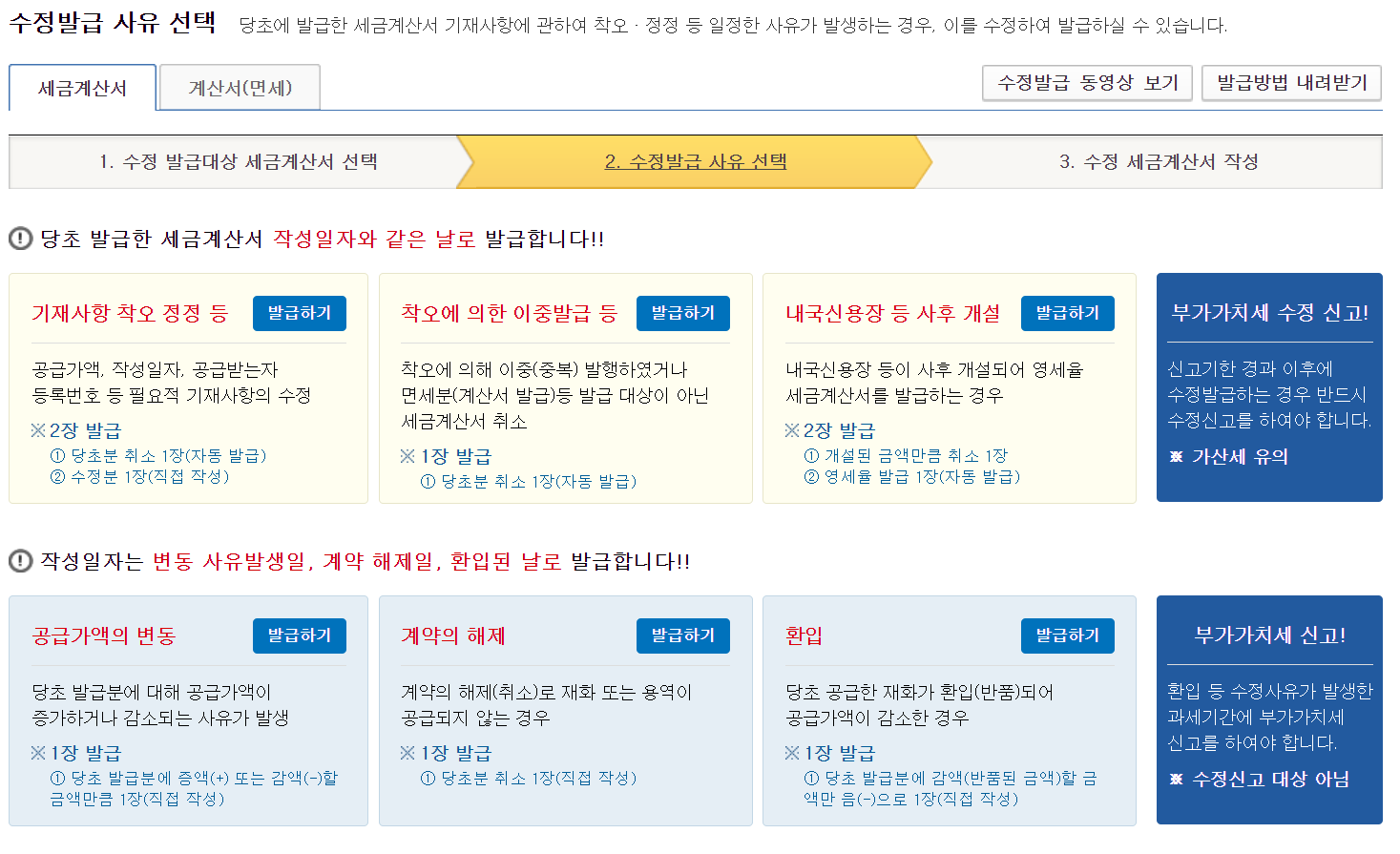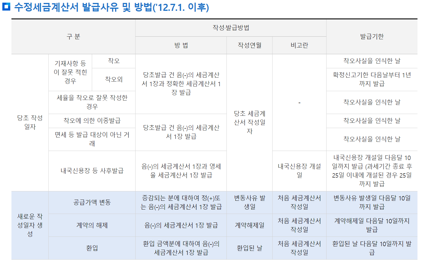 - 발급 사유 : 필요적 기재사항 등이 착오로 잘못 작성한 경우(비고 : 공급가액, 작성일자 등), 필요적 기재사항 등이 착오 외로 잘못 작성한 경우는 공급일이 속하는 과세기간에 대한 확정 신고 기한까지 가능, 세율을 잘못 적용하여 발급 한 경우. (비고: 공급받는 자, 사업자등록증)