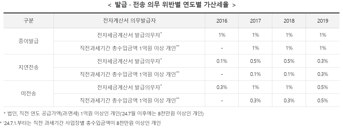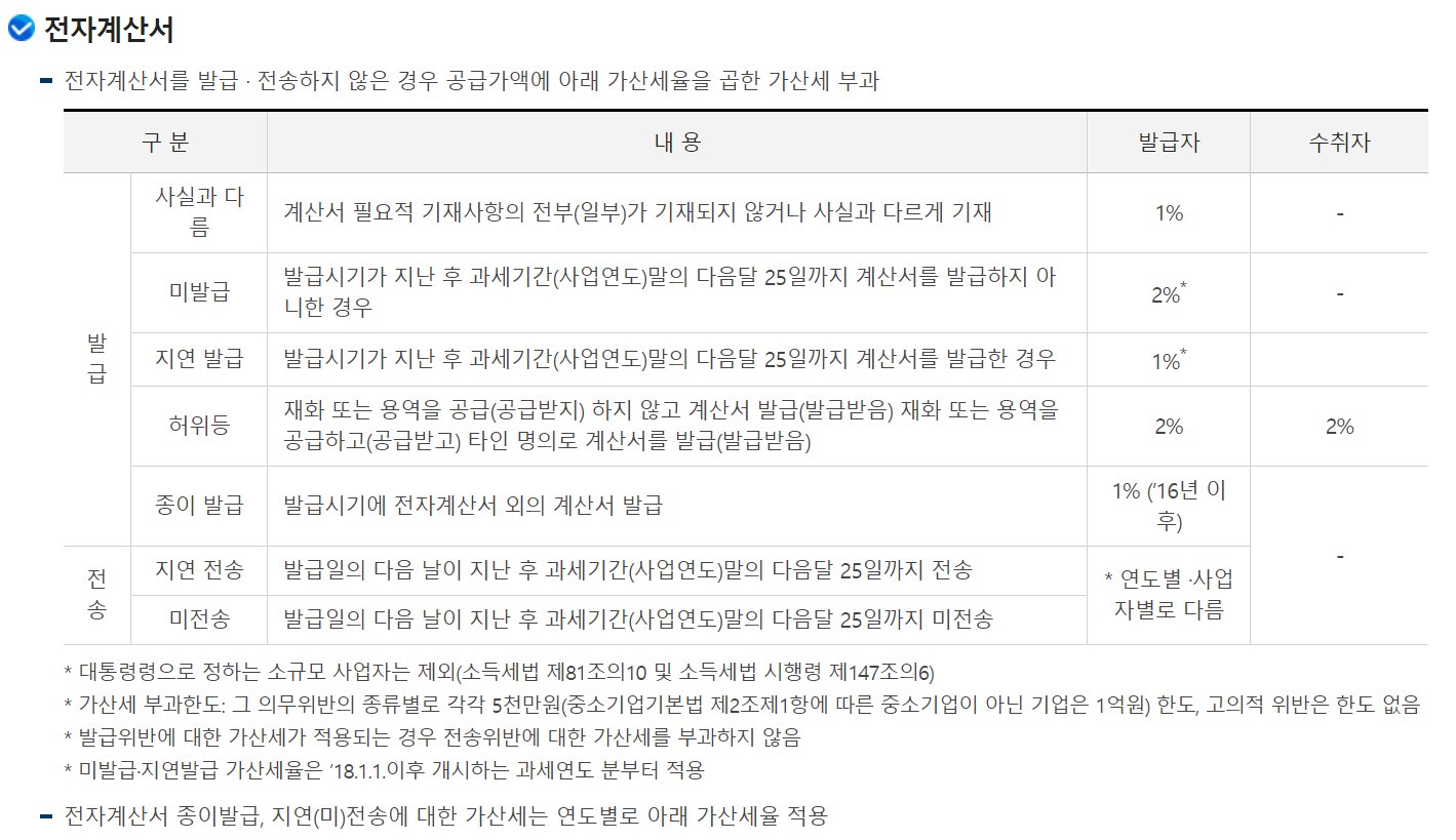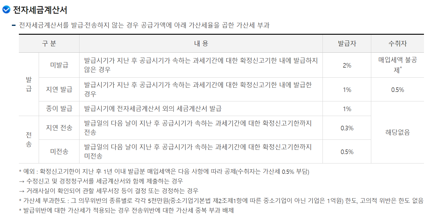 발급하지 않은 경우에 공급가액의 본인이 해당하는 가산세율이 부과됩니다. 미발급, 지연발급 등의 사유에서 발생됩니다. 발급자와 수취자 모두에게 불이익이 발생할 수 있으니 마감일 전에 꼭 확인 바랍니다.