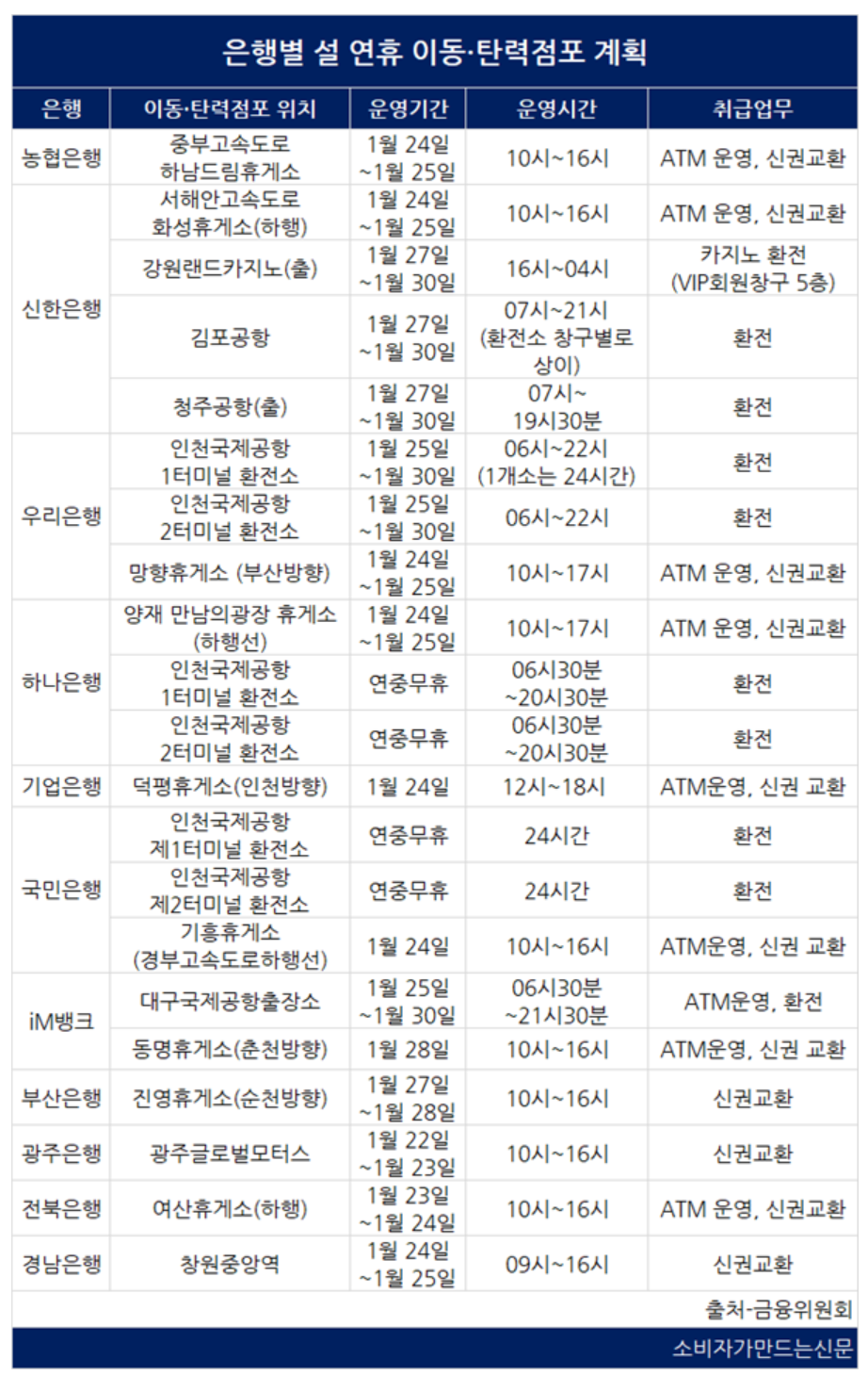 금융권은 설 연휴 금융거래를 위해 11개의 은행이 입·출금 및 신권 교환이 가능한 이동·탄력점포를 운영합니다.