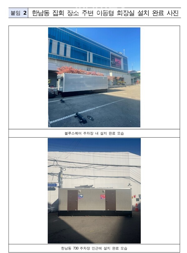 집회 현장에서 가장 난감한 순간, 바로 화장실을 찾아 헤매는 순간이었죠? 기존 개방 화장실로는 역부족이었고, 한강진역까지 가기엔 너무 멀었고 불편했습니다.