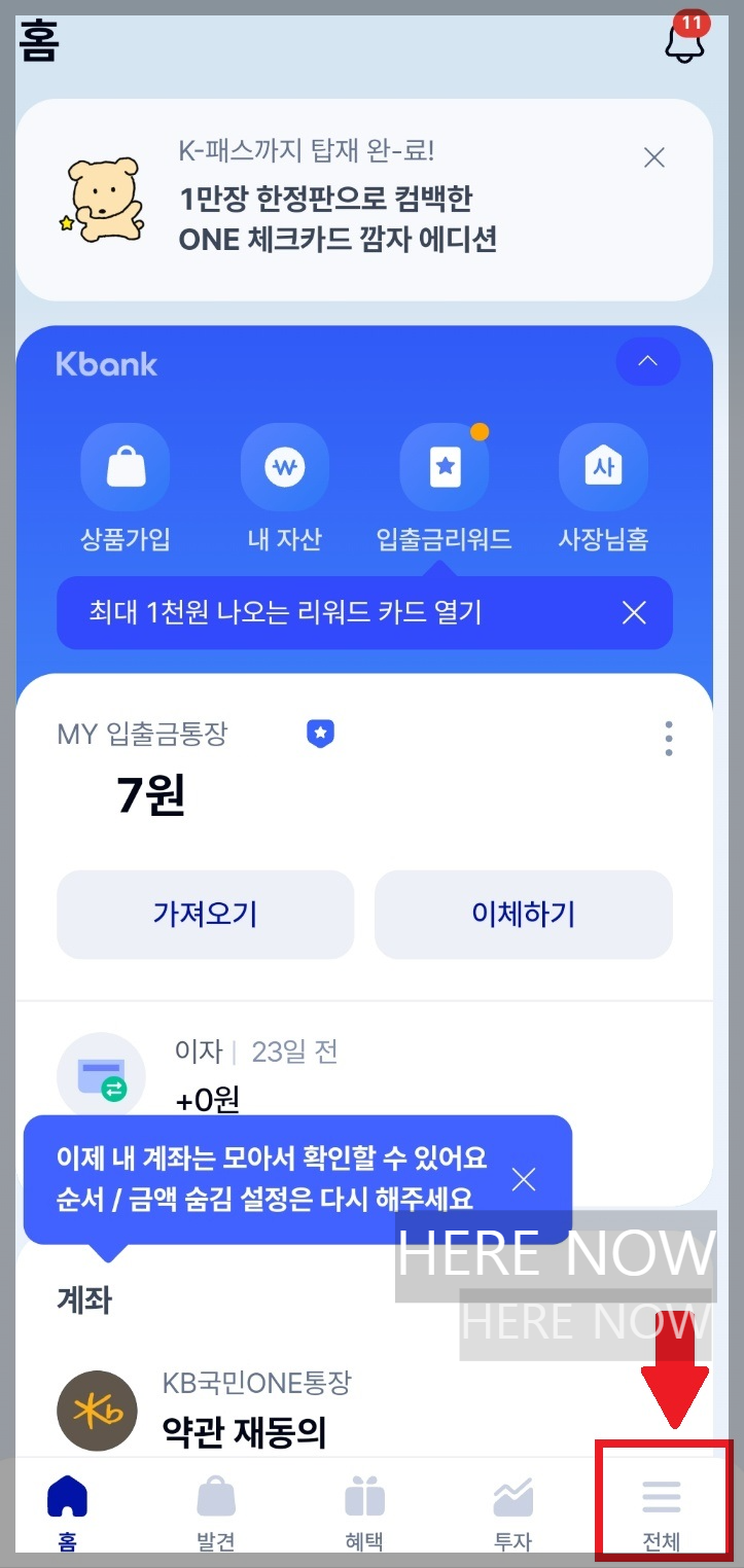 - 케이뱅크앱을 실행하면 처음 보이는 화면에서 오른쪽 아래쪽에 '전체'를 클릭