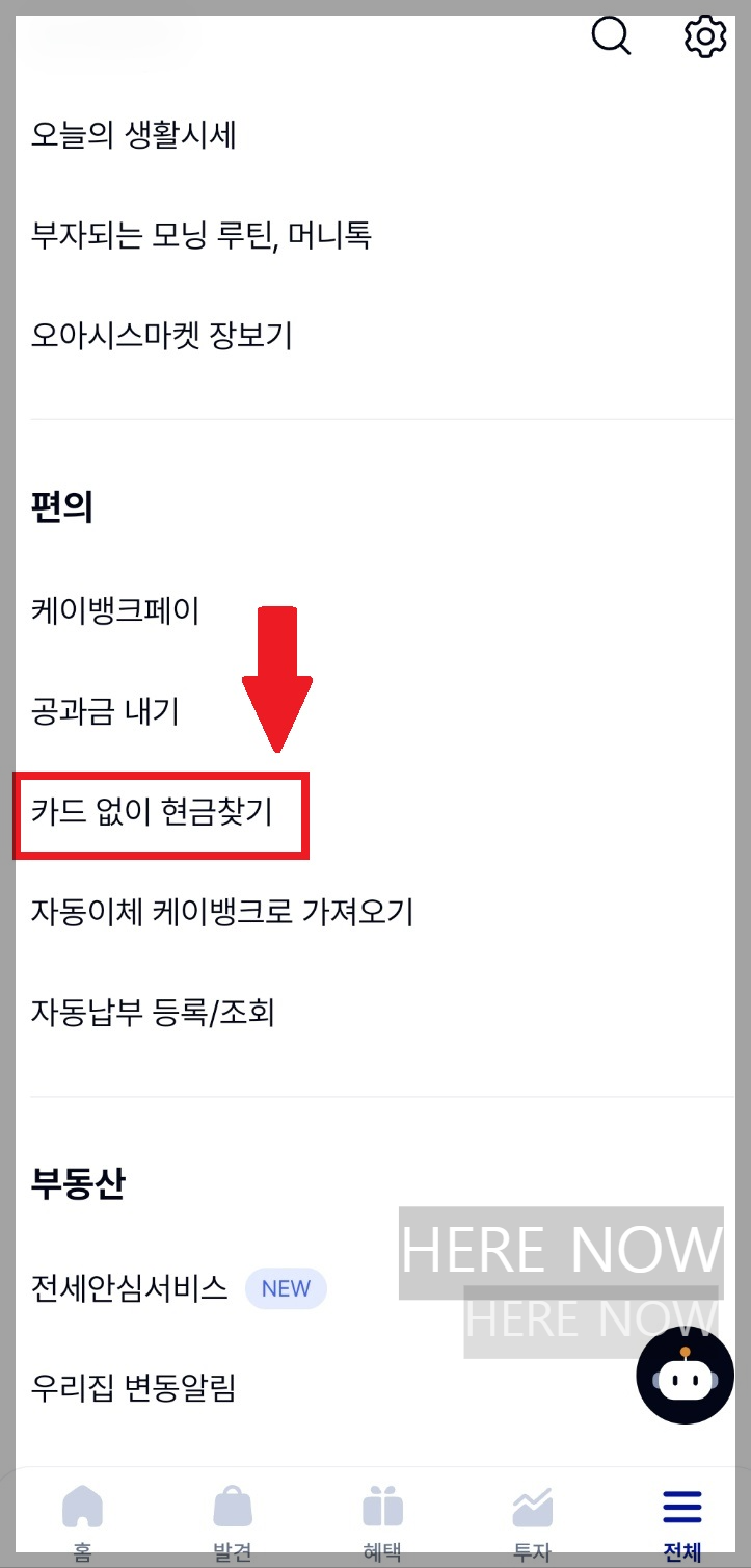 - 아래로 조금 더 내리면 '편의' 부분에 '카드 없이 현금 찾기'를 클릭합니다.