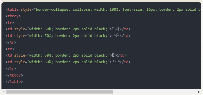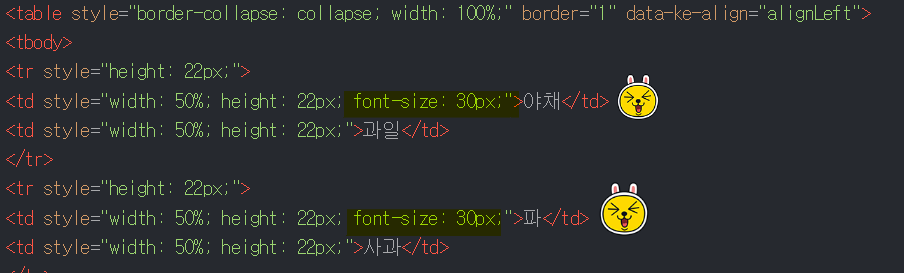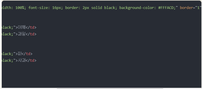 내부 셀의 컬러는 " background-color: #FFFACD;"를 추가하여 편집하면 됩니다.
