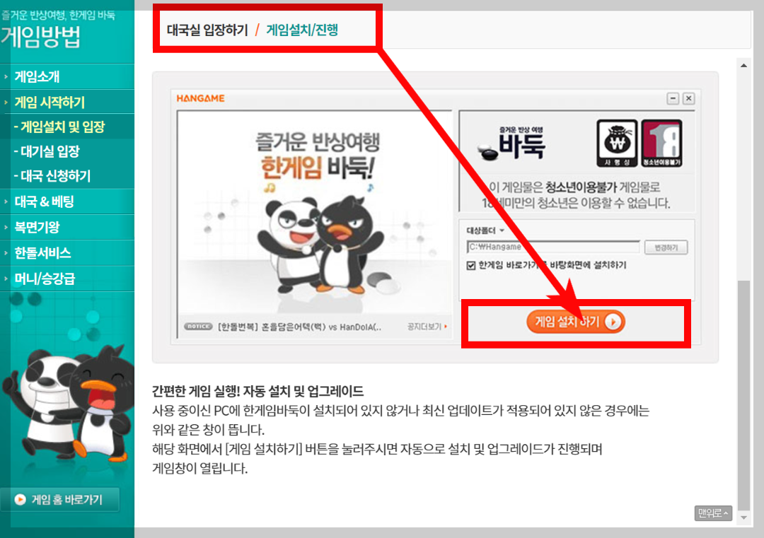 2. 홈페이지에서 '게임 설치하기' 버튼을 클릭합니다.
