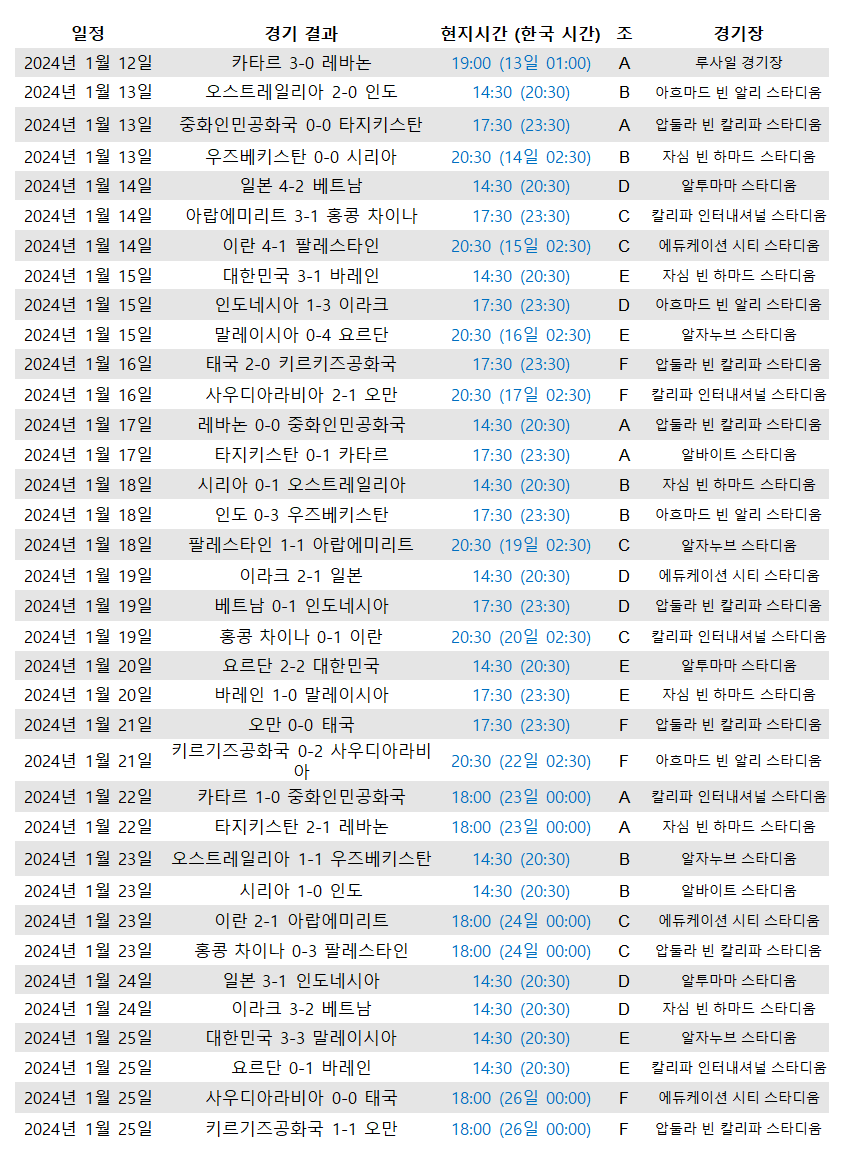 | 2024년 2월 7일 | 이란 vs 카타르 | 18:00 (8일.목 00:00) |