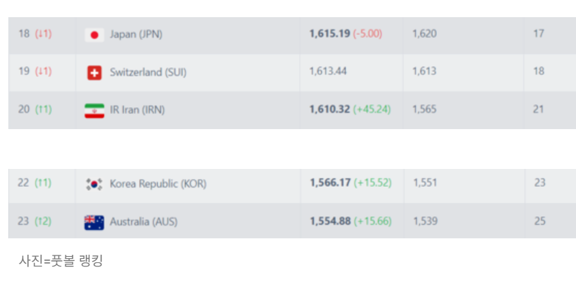 이날의 경기 패배로 일본은 FIFA랭킹에도 타격을 입었습니다. 풋볼랭킹에 따르면 이란과의 경기 이전까지는 1,620.19점으로 17위에 올랐던 일본은 패배이후 5점 감점된 1,615.19점을 기록하여 한단계 하락한 18위로 이름을 올렸습니다. 반면 극적인 승리로 4강전 진출을 확정지은 한국은 15.52점을 추가하여 FIFA 랭킹 순위는 22위로 등극했습니다.