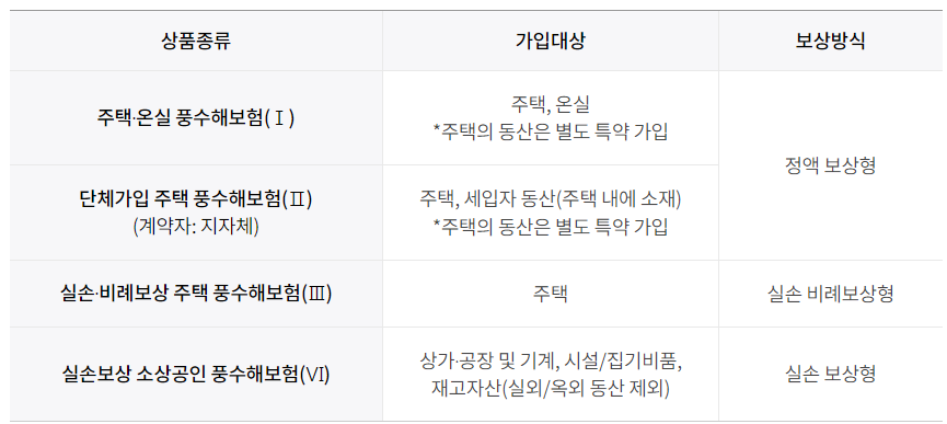 풍수해 보험 주요 보상하지 않는 손해(풍수해 Ⅰ,Ⅱ,Ⅲ,Ⅵ관련)