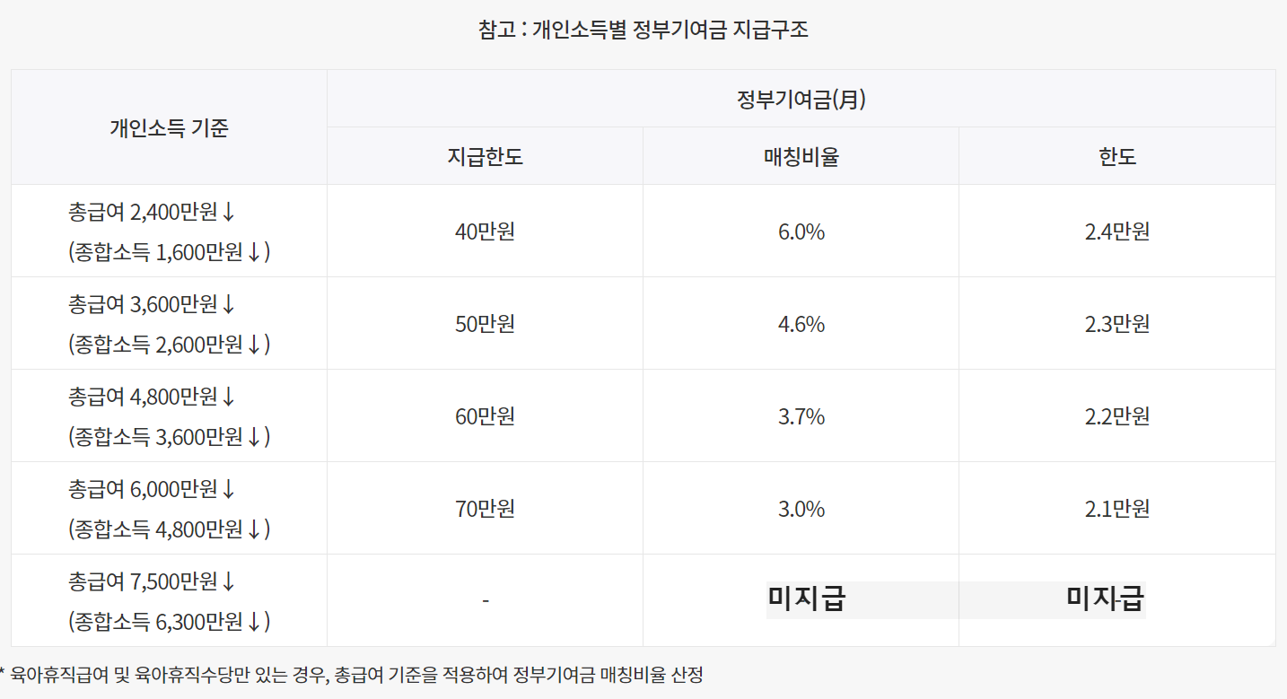 납입한 금액에 비례해 소득구간별 정부기여금 지원합니다.
