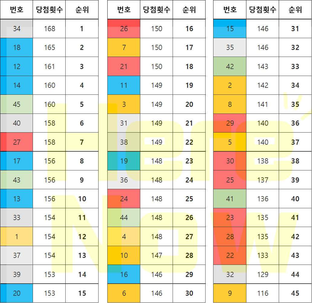 로또번호 가장 많이 나온 숫자 (보너스 번호 미포함)