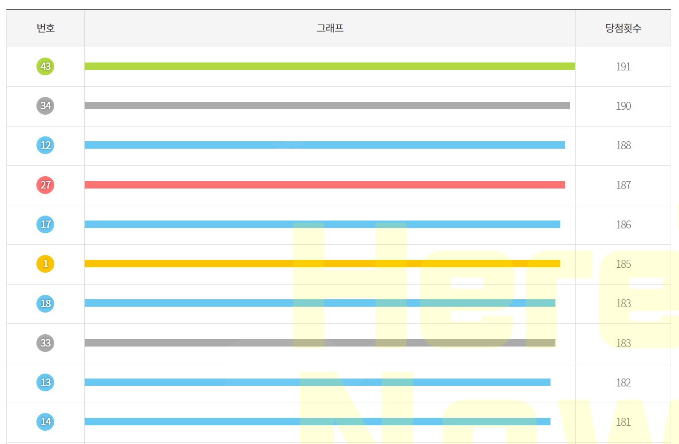 로또번호 가장 많이 나온 숫자 (보너스 번호 미포함)