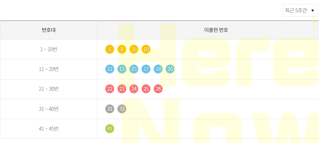 4) 기간별 미출현 번호(최근 5주간)