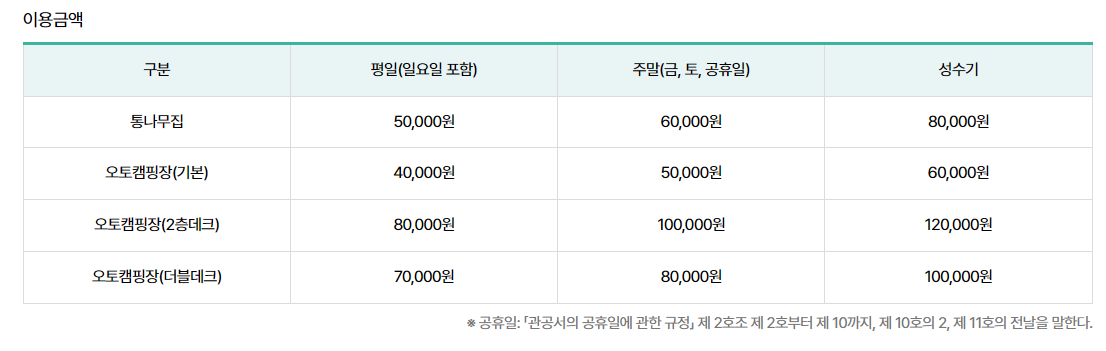 예약 : 캠핑장 공식 사이트에서 예약 가능. 1박 40,000원~100,000원