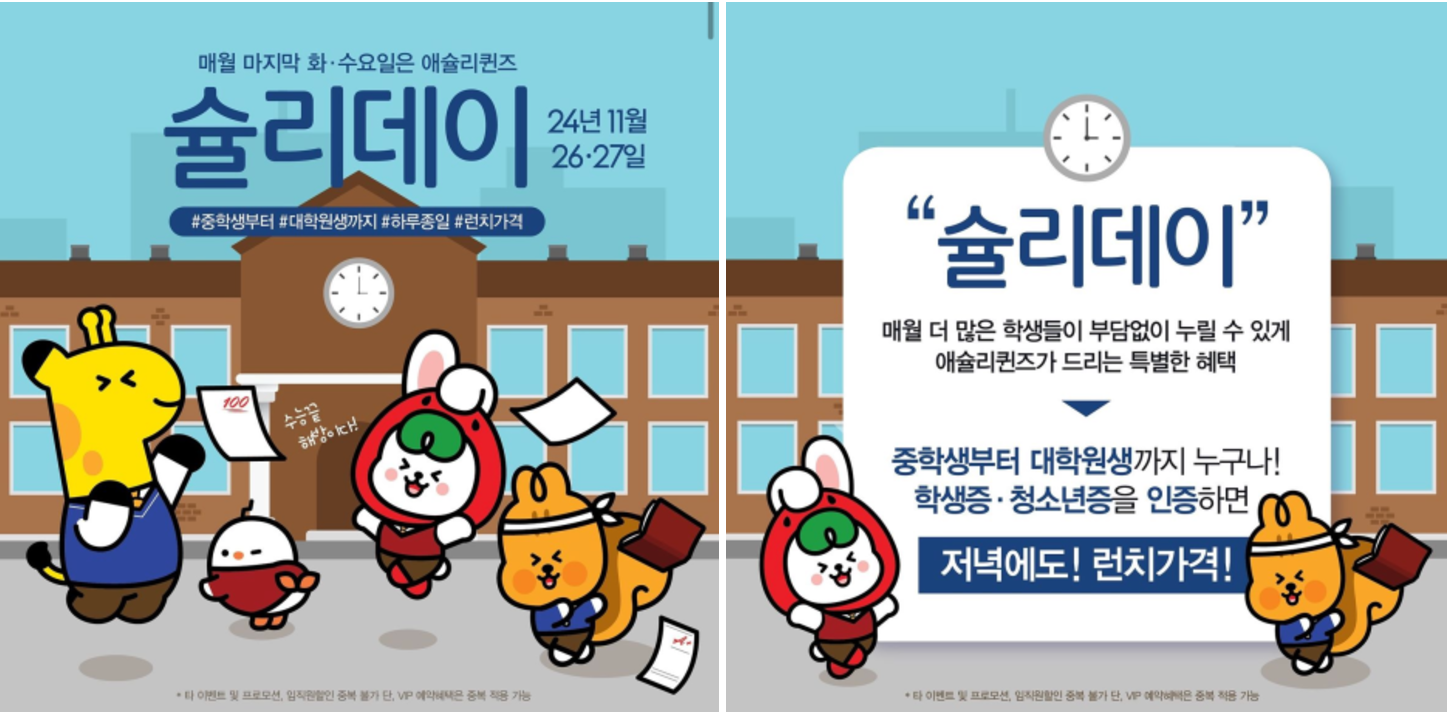 애슐리는 "슐리데이"프로모션을 통해 매월 마지막 주 화요일과 수요일에 중고등학생, 대학생, 대학원생에게 할인 혜택을 제공합니다.