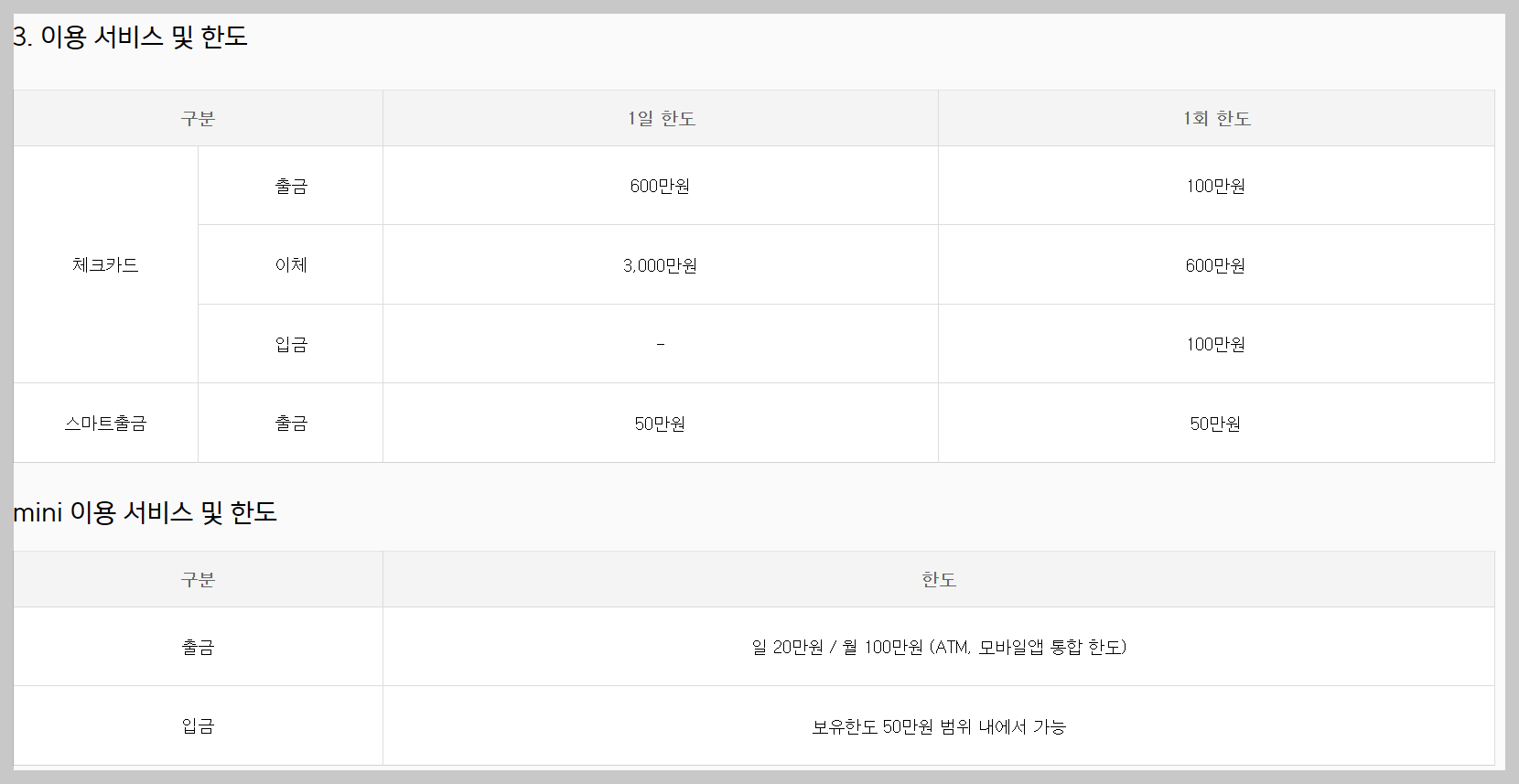 | 구분 | 1회 한도 | 1일 한도 |